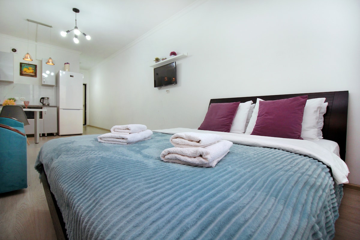 Garsonjera z elegantnimi zaključki v novem vrhunskem stanovanjskem kompleksu se nahaja v osrednjem okrožju Almatyja, 5 minut hoje od nakupovalnega in zabaviščnega centra MEGA park. Studio ima vse, kar potrebujete za udobno romantično ali poslovno potovanje, od udobne postelje do priložnosti za pripravo zajtrka ali večerje. Gostje imajo dostop do televizije z Netflixom in dostopom do interneta, Wi-Fi-ja, pralnega stroja, sušilnika za lase, kuhinje in posteljnine. Uživajte v elegantnem doživetju v osrčju mesta.