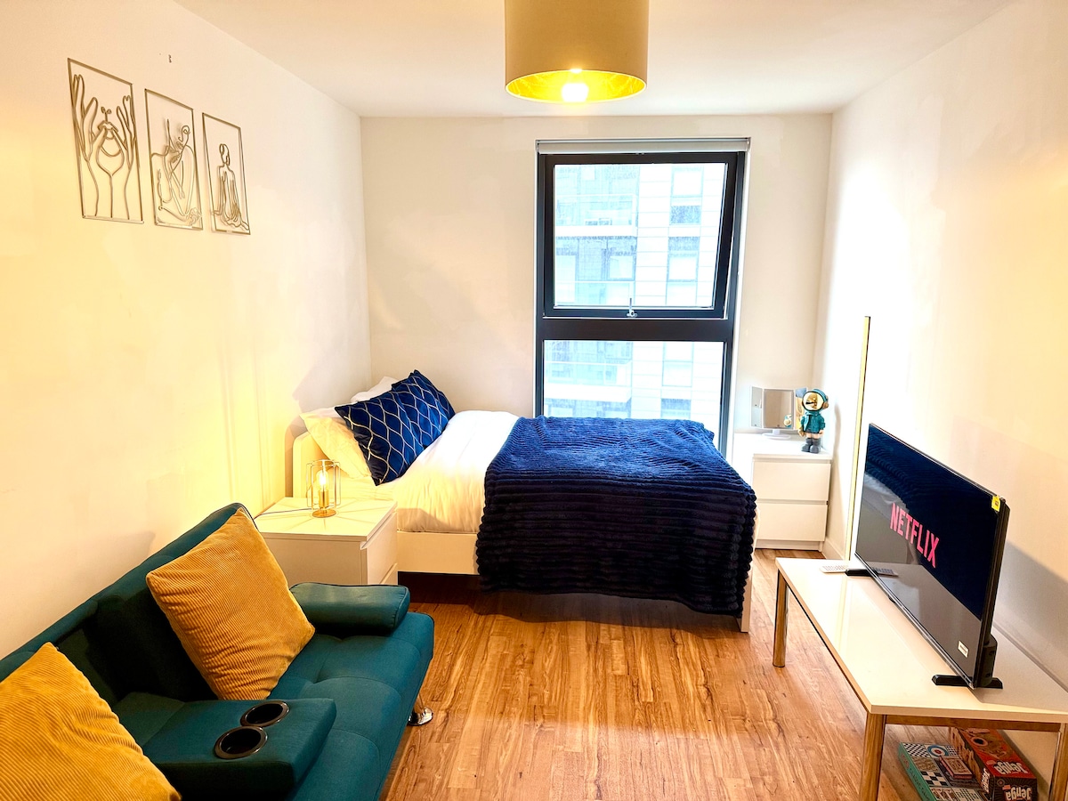 Dobrodošli v mestnem kotičku, našem elegantnem 1-posteljnem stanovanju v MediaCityUK Na novo zgrajeno prenočišče, opremljeno za udobje in osupljiv razgled, v katerem se lahko izgubite. Sprostite se z razkošno vzmetnico in pametnim televizorjem. Osvežite se z elegantno kopalnico in prho. Kuhajte v dobro opremljeni kuhinji. Spodnje nadstropje se ponaša s telovadnico, kinom, konferenčno sobo in teraso. Trenutki iz trgovin, restavracij, gledališč in stadionov. Pred nami je tramvajska postaja, BBC/ITV pa je le sprehod stran. Popolno za posel in prosti čas.