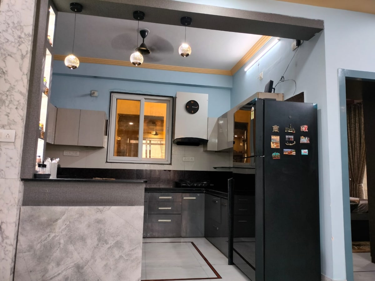 Ideal home for a FAMILY - Luxurious 2-bed, 2-bath apartment in Udaipur’s busy location ideal for families, travel enthusiasts or working professionals. Sleeps 5 with 2 double beds + 1 divan-style sofa bed. Modern décor, 70”smart TV, L-shaped sofa, AC in every room, two balconies, fully equipped kitchen, and workspace. Walking distance to cafes, restaurants, shops, temples, schools. Housekeeping and daily cleaning ( available on prior request) included in the price.