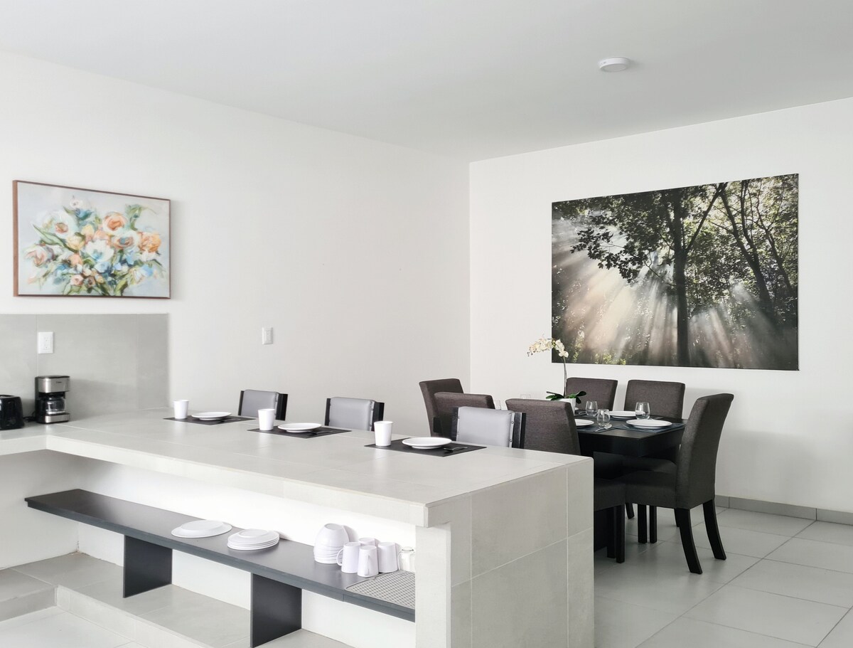 Novo stanovanje, udobno, priključeno na moj dom. Popolnoma neodvisno in nadzor nad garažo je zagotovljen. Po vsakem bivanju je zelo čist in razkužen. Nahaja se 3 ulice od glavnega trga Cd Fernandez, 10 minut od poti do izvira Media Luna in 9 minut od središča mesta Rioverde. Strateško se nahaja v bližini glavnih avenij in bulvarjev. Ima hladilnik, mikrovalovno pečico, pametno televizijo, lokalno kabelsko televizijo, klimatsko napravo in Wi-Fi. Vključuje vodo, kavo in čaj.