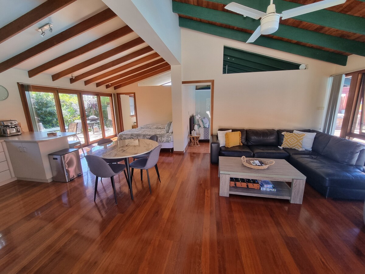 Za posel ali prosti čas je naš novi studio bungalov zasnovan za sprostitev in priročnost ter zagotavlja vse, kar potrebujete za prijetno in nepozabno bivanje. Ta zasebni bungalov je ločen od naše glavne hiše in ima udobno zakonsko posteljo (Queen) s posteljnino HTC, enojno posteljo, TV in kavč. Opremljena kuhinjska niša omogoča enostavno pripravo obrokov, kopalnica pa vključuje pralnico za dodatno udobje. Ljubitelji plaže bodo navdušeni nad hitrim dostopom do plaže Corindi za sonce, pesek in deskanje.