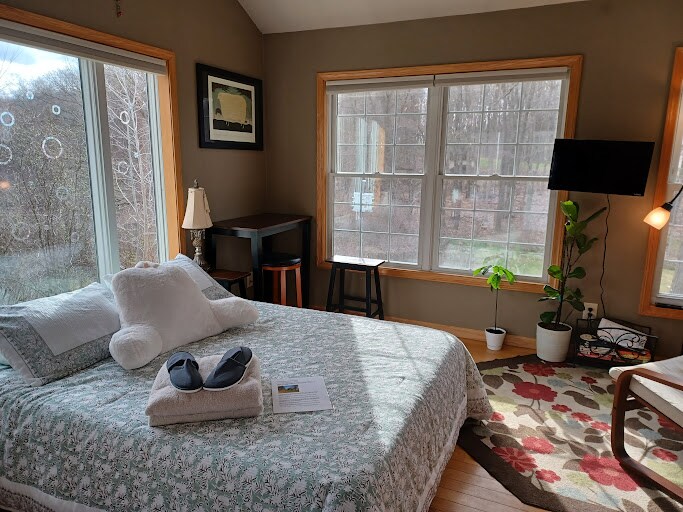 TheTree House Studio, nasproti turkizne vode Round Lakea, je idealen za zabavo ob jezeru, pohodništvo, ribolov, sproščujoč oddih, pisatelj ali umetniški umik ali sprememba tempa iz domače pisarne Uživajte v zasebnem stanovanju, hkrati pa si delite veliko teraso, žar, dvorišče in masažno kad (upoštevajte, da masažne kadi zahtevajo vzdrževanje in da občasno ne bodo na voljo za kratek čas) Park Round Lake je za vogalom 20 minut od Jacksona, eno uro od Lansinga/ Ann Arborja
