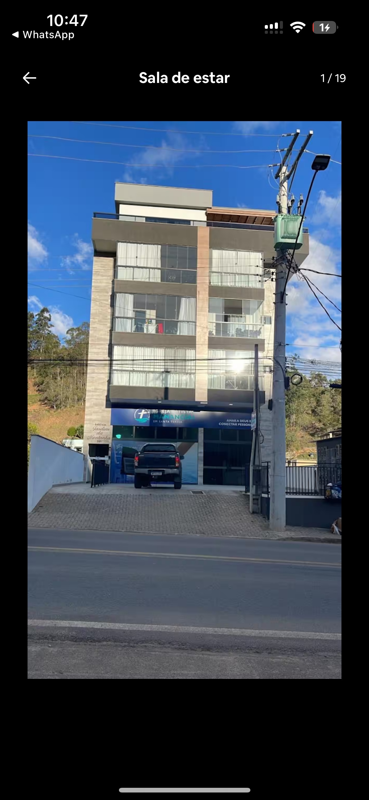 Apartamento com dois quartos recém-construído na rua da Igreja Matriz de Santa Teresa/ES. Fica no centro da cidade e em poucos passos você está na rua do lazer. Possui móveis planejados na cozinha e quartos amplos com espelhos. Os banheiros são espaçosos e o apartamento é ideal para receber 2 casais. Possuímos apenas 2 camas de casais, são 2 quartos. Um dos quartos é suíte. Na varanda temos uma bela vista para o centro de Santa Teresa/ES.