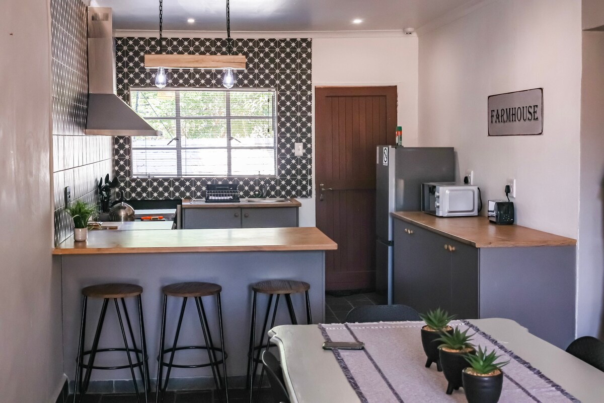 Make yourself at home in this cozy and stylish space. A self-catering unit perfect for guests who value privacy and comfort. -Queen-size bed -Bunkbeds -TV -Fridge -Microwave -Free Wi-Fi -Inverter for power backup Everything you need for a relaxed and memorable stay. Beautiful, simple and just right.
