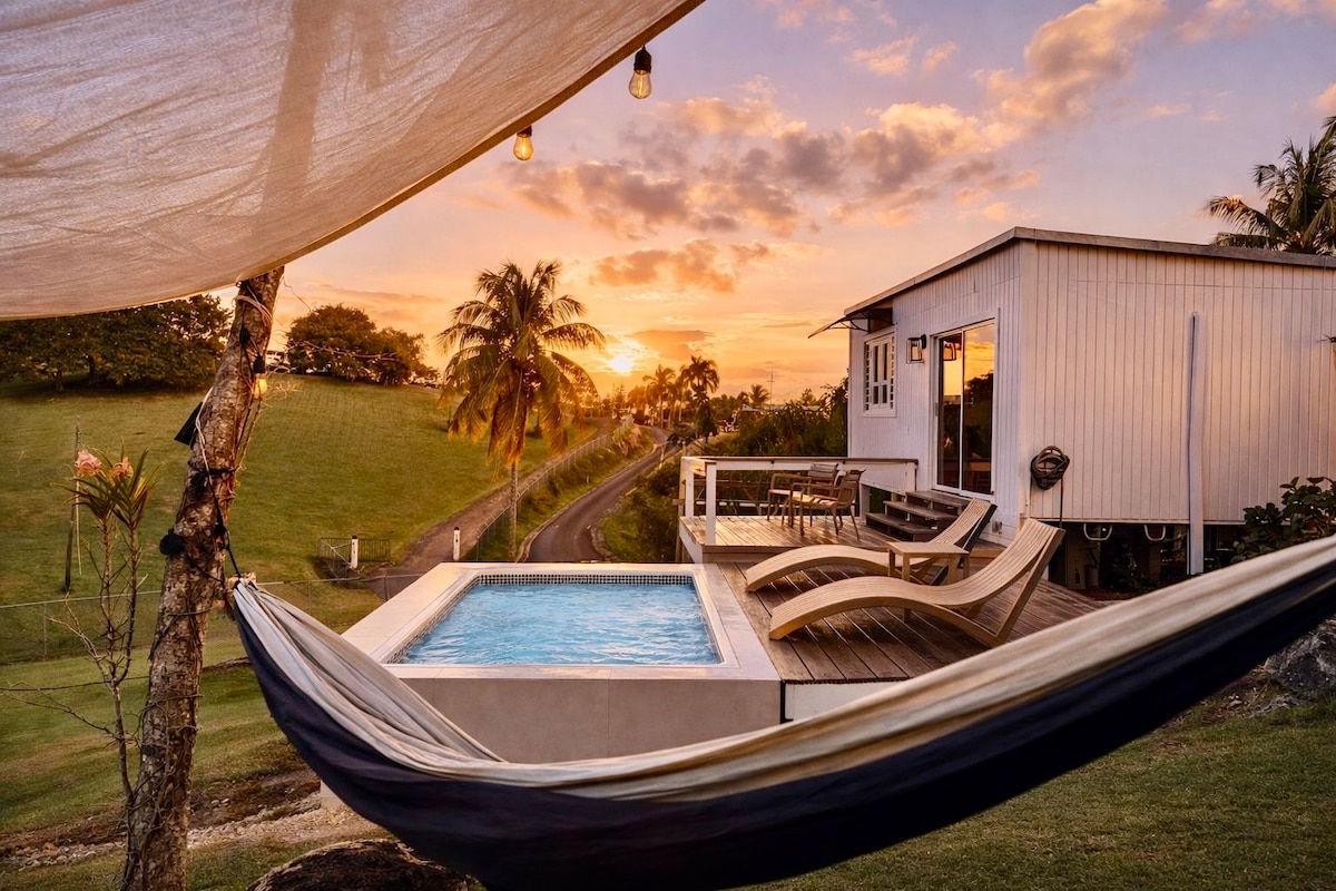 ✈️ 18 minutes to airport & 🏖️ beaches 🏊 Brand new pool with loungers & hammock 🌿 Peaceful countryside, just 5 minutes to city 🌴 45 minutes to El Yunque & Luquillo Beach 🏡 Hilltop cabin with ocean & mountain views 🛏 Open-concept + extra bed (sleeps 3) 🍽 Equipped kitchen with gas stove 🌅 Stunning sunrise views from elevated setting ⚡ Fast WiFi, A/C, smart TV & gated parking 🪑 Beach chairs, towels & cooler