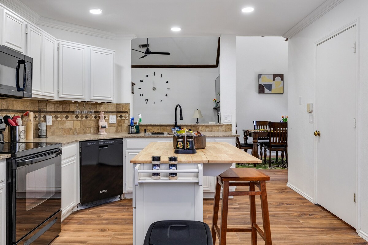 Dobrodošli v svojem drugem domu! To prostorno bivališče s 3 posteljami in 2 kopalnicama se nahaja v odlični soseski, primerni za družine, v bližini trgovin, restavracij in lokalnih znamenitosti. Le nekaj minut vožnje od pivnice The Star, hotela Omni PGA Frisco, nakupovalnega središča Stonebriar in studiev Universal Studios. Skupni bazen je odprt samo od 24. maja do 13. oktobra od 9.00 do 21.00. Pred hišo je na voljo parkirišče za največ štiri avtomobile. Garaža je na voljo samo za goste, ki bivajo 7 dni ali dlje. Otroški stol za hranjenje in otroška posteljica (kletka za igranje) sta na voljo po predhodnem dogovoru.