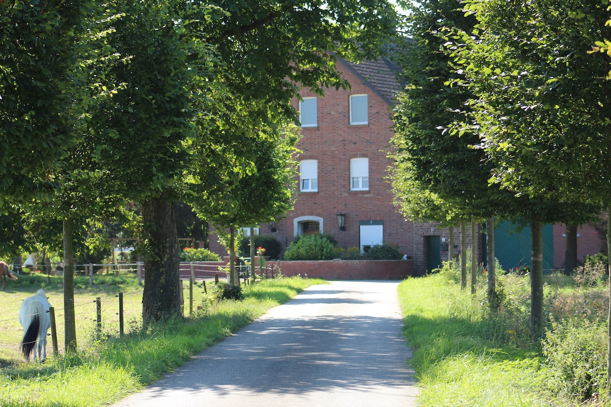 Stanovanje na kmetiji s poniji z 2 sosednjima spalnicama + raztegljivim kavčem (dnevna soba) za največ 8 oseb. Popolnoma na novo prenovljeno stanovanje s površino 90 m2 (+25 m2 velika shramba za kovčke itd.). Več kot 30 nasvetov za prosti čas in izlete v bližini (oglejte si potovalni vodnik ali spletišče) Otroška šola jahanja na terenu: Povprašajte o jahanju in (degustacijskih) učitvah jahanja za otroke in najstnike. Prenočitev in nastanitev za pohodnike/ konje.