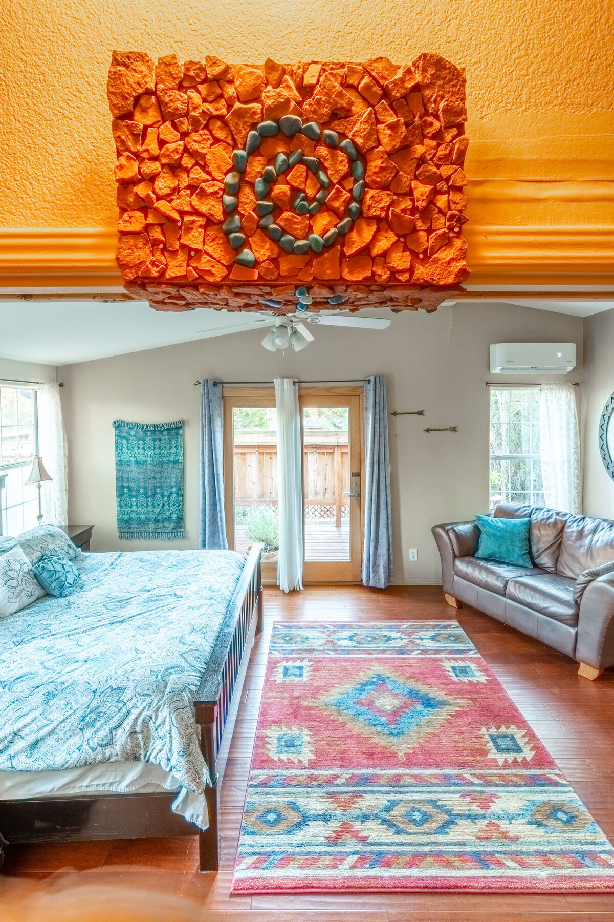 We have a beautiful studio in the heart of Sedona. Its spacious with breathtaking views of the red rocks. Close to numerous trail heads and delicious restaurants. The home is fully solar powered with fresh No-voc paint and cleaned with organic products. There is a huge free standing tub to relax in. The studio has a cozy kitchenette with a full size refrigerator. The private redwood deck is an ideal place to have coffee as you savor one of the best views of Thunder Mountain.