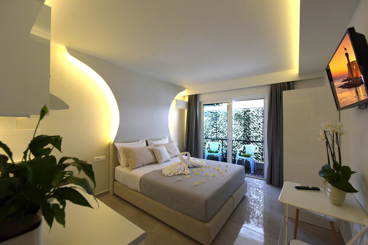 Počutite se kot doma, ko ste daleč od doma. Russelia Suite Rhodes je okusno urejeno, sveže prenovljeno stanovanje v osrčju Rodosa. Uživajte v čudovitem razgledu na bujne zelene vrtove, medtem ko srkate kavo na balkonu. Sprostite se v dnevni sobi z odprtim prostorom po plavanju na eni od čudovitih plaž na otoku ali pa uživajte v domačem obroku s prijatelji. Po celodnevnem potepanju in raziskovanju se vrnite v prostorno zakonsko posteljo z udobno in gostoljubno matrico.