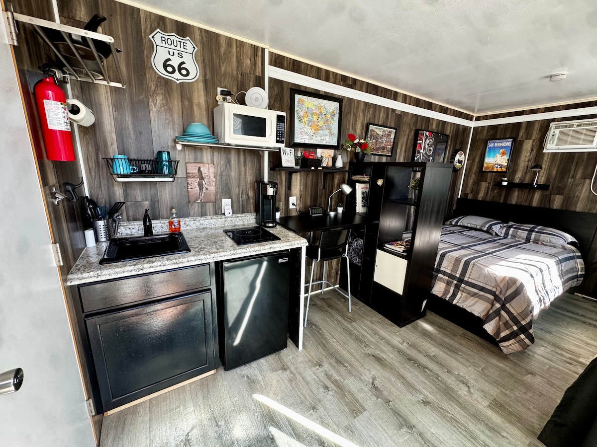Sprostite se v tem edinstvenem, mirnem in udobnem mini prenočišču na našem dvorišču. Obdan z lepim vrtom s široko paleto sukulentov in sproščujočim bazenom. S prostorom za uživanje v branju ali poslušanju glasbe. Opremljen je z mikrovalovno pečico, aparatom za kavo Keurig, mini hladilnikom, opekačem kruha, mešalnikom, pralnim/sušilnim strojem in namiznim priborom. Mini dom ima klimatsko napravo in ogrevalni sistem za udobje ter pametno televizijo. Zabave niso dovoljene.(PROSTOR, OPREMLJEN SAMO ZA 2-3 OSEBE *ne več kot 3 osebe *)
