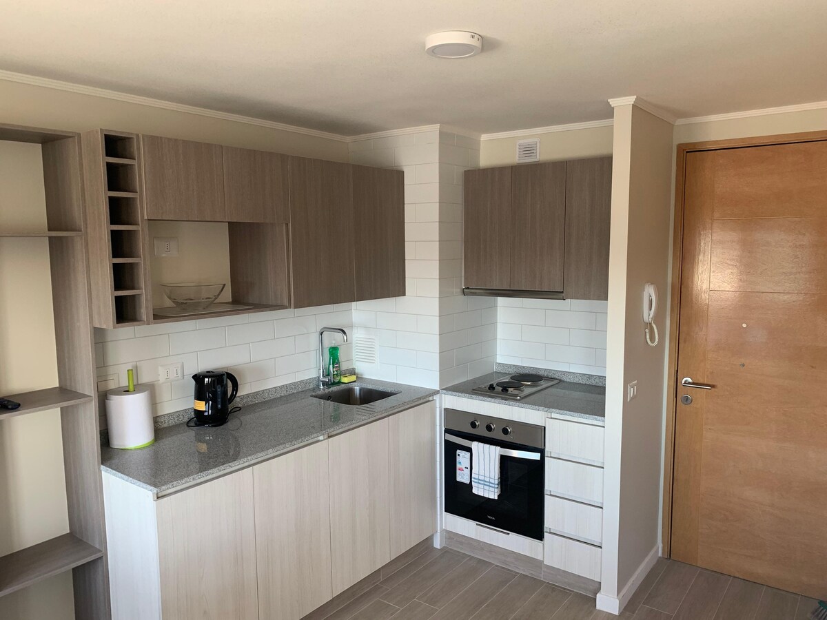 Your perfect stay in Concepción! Modern 1-bedroom apartment, ideal for travel, work, or a quick stopover. Just 5 min from the airport and 3 min from the mall. Safe and quiet residential area. Enjoy comfort, style, and everything you need for a great stay. 🛏️ Double bed + single sofa bed 🌇 Private terrace 🏋️ Gym + laundry access 🚗 Free parking 📡 Fast WiFi + TV 🍳 Fully equipped kitchen Book now and feel like home!