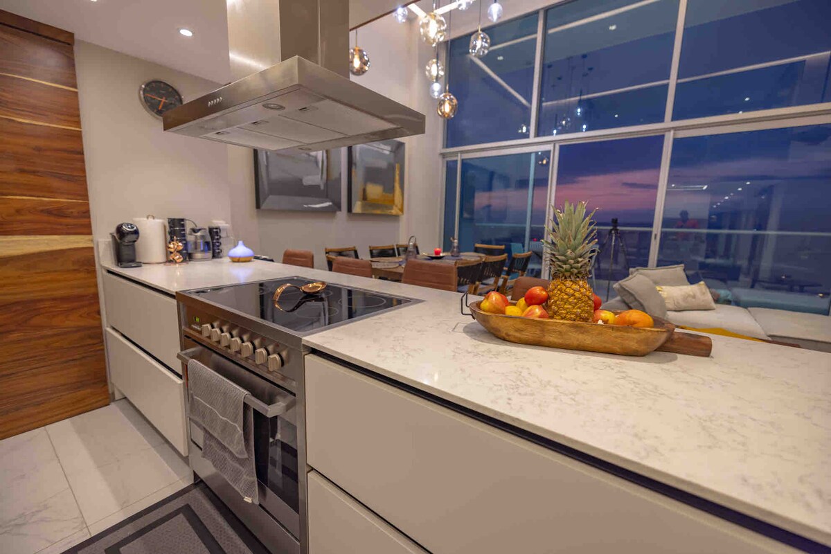 Prebudite se v garsonjeri v 7. nadstropju v Harborju 171 in uživajte v osupljivem pogledu na ocean. Uživajte v kraljevski postelji, hitrem Wi-Fi-ju, pametnem domu Alexa in ugodnostih v slogu letovišča, vključno z ogrevanimi bazeni, masažno kadjo, telovadnico in 24-urnim receptorjem. Idealno za pare ali delavce na daljavo, le nekaj minut od središča mesta, soseske Versalles in romantičnega območja. Doživite razkošje, udobje in nepozabne sončne zahode ob Smaragdnem morju.