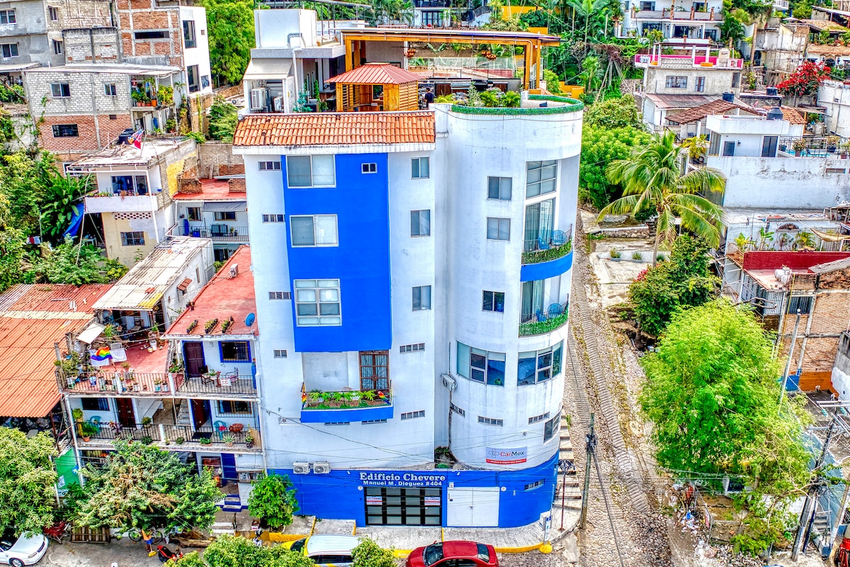 Ta udobna garsonjera je najboljši kraj v Puerto Vallarti za opazovanje sončnih zahodov. Zbudite se z osupljivim razgledom na ocean in uživajte v zlatih sončnih zahodih vsak dan v varnem in sproščujočem bivališču v osrčju Playe del Carmen, le nekaj korakov od plaže in znamenite promenade Malecón. NAJBOLJŠI SONČNI ZAJDI! Dostop do panoramske razgledne točke, več bazenov in sončnih teras na kraju samem ter udobna postelja, klimatska naprava, popolnoma opremljena kuhinja in hitri internet Idealno, če iščete udobje in najboljšo lokacijo za raziskovanje restavracij, trgovin, umetnosti in nočnega življenja