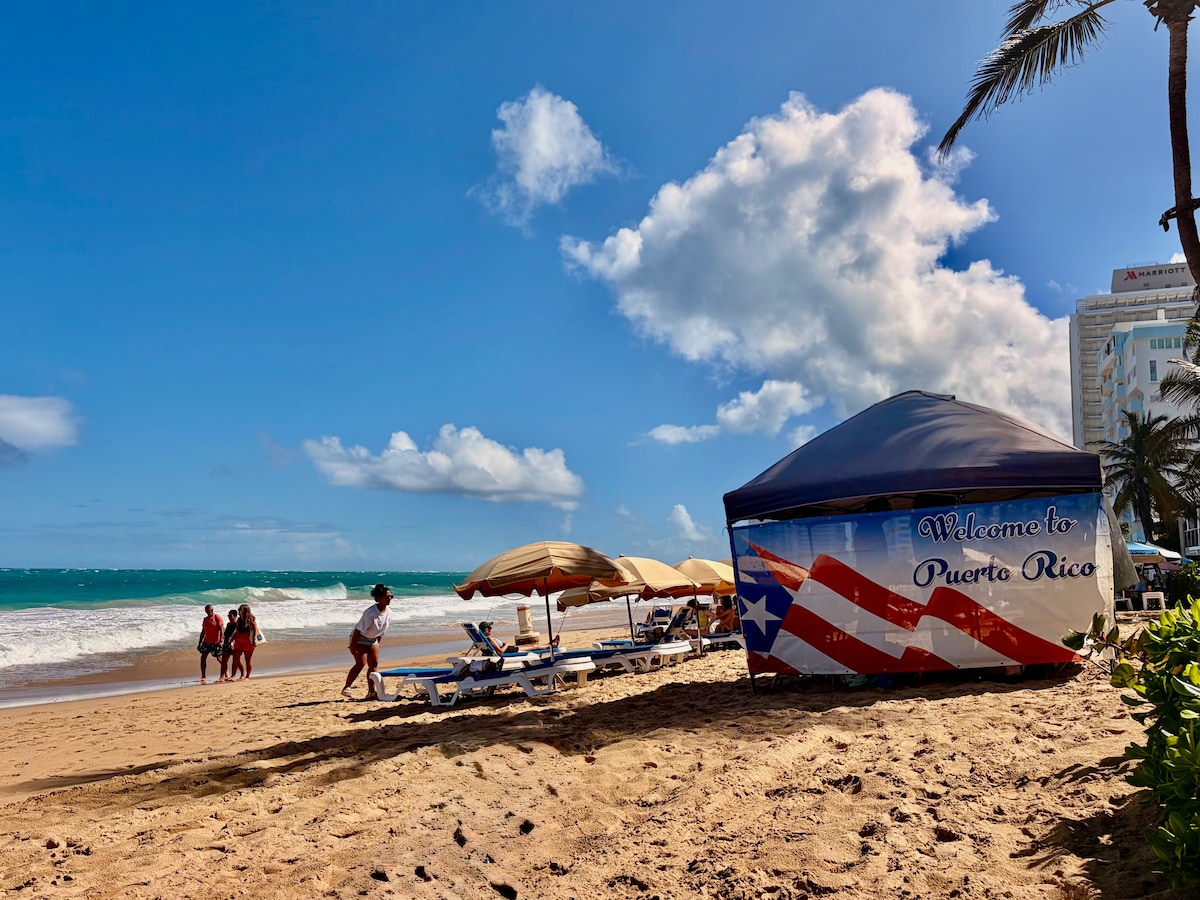 Na novo prenovljeno studio stanovanje neposredno čez cesto od zlahka dostopne plaže Condado Beach v San Juanu. Od letališča je oddaljen manj kot 10 minut hoje, do restavracij, barov, igralnic in trgovin pa se lahko sprehodite. Uživajte v čudovitem pogledu na ocean z balkona in številni opremi, ki jih ponuja ta namestitev, vključno s prostorom »delo od doma«.