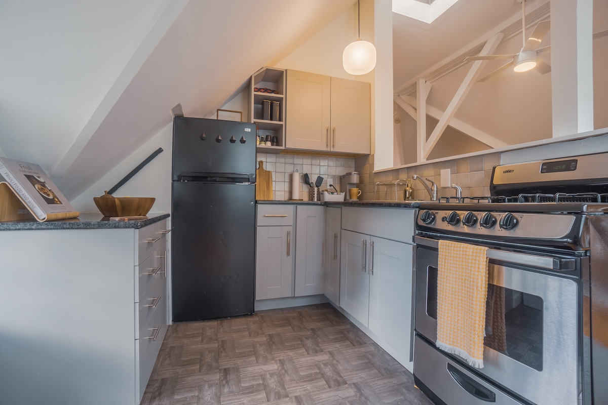 Stanovanje je zasebno in v ločenem krilu predelanega tovarniškega kompleksa, ki vključuje stavbo z lastnikom in umetniški atelje v mirni stanovanjski soseski. Ena spalnica v pritličju s kopalnico v bližini. Druga spalnica je v predelanem stanovanju z zakonsko posteljo (Queen) z dnevno posteljo v prostoru za sedenje za dva dodatna gosta. Z veseljem sprejmemo čiste hišne ljubljenčke, ki se lepo obnašajo. (Doplačilo za hišne ljubljenčke v višini 50 $) Za doplačilo sta na voljo sedenje hišnih ljubljenčkov in sprehod s psi. Na voljo je tudi varstvo otrok na lokaciji.