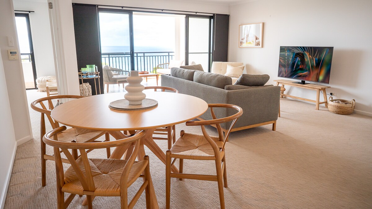 Osupljivo luksuzno stanovanje ob plaži. Nahaja se na plaži First Bay v Coolumu. »Three Bays« je majhen kompleks, ki ga sestavljajo 4 stanovanja. Ponaša se z osupljivim razgledom na ocean. Lahka, svetla, čudovita notranjost. Dobro opremljena kuhinja z vrhunskimi napravami. Pripravite obrok, medtem ko uživate v pogledu na ocean, ki ga je mogoče videti iz vsake sobe. Popolna lokacija za opazovanje kitov, ki se selijo od junija do novembra vsako leto.