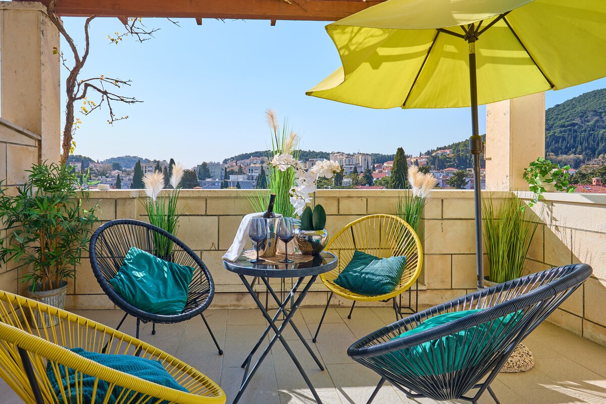 Uživajte v prekrasnem sončnem zahodu in pogledu na obalo Dubrovnika z vašega balkona. Obdan z bujnimi rastlinami in drevesi se ta udoben in prostoren apartma nahaja na očarljivem in mirnem polotoku Lapad. Apartma je na novo prenovljen in nekaj korakov stran od lepih sprehodov, majhnih zalivov , prodnatih in peščenih plaž okoli zaliva. Začnite dan s kopanjem v Jadranu in ga zaključite s spektakularnim sončnim zahodom nad otoki.