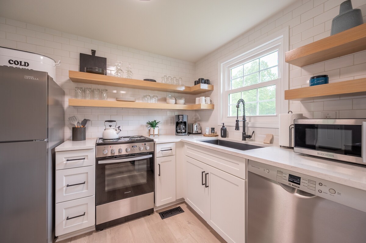 Pojdite v zasebno okolico v okrožju Floyd s svojo mini-hiško. Nahaja se le 15-17 minut vožnje do središča Floyda. Naša mini-hiška se nahaja na 2 hektarjih v mirnem, podeželskem okolju z dovolj prostora za vso družino. Priporočamo uporabo celotne lokacije za kampiranje v šotoru ob mini-hiški. Čajna kuhinja z zunanjim žarom, kopalnica s kadjo s kremplji, zložljiv pralni/sušilni stroj, centralni HVAC in brezplačno polnjenje električnih vozil 2. stopnje so le nekatere od opreme.