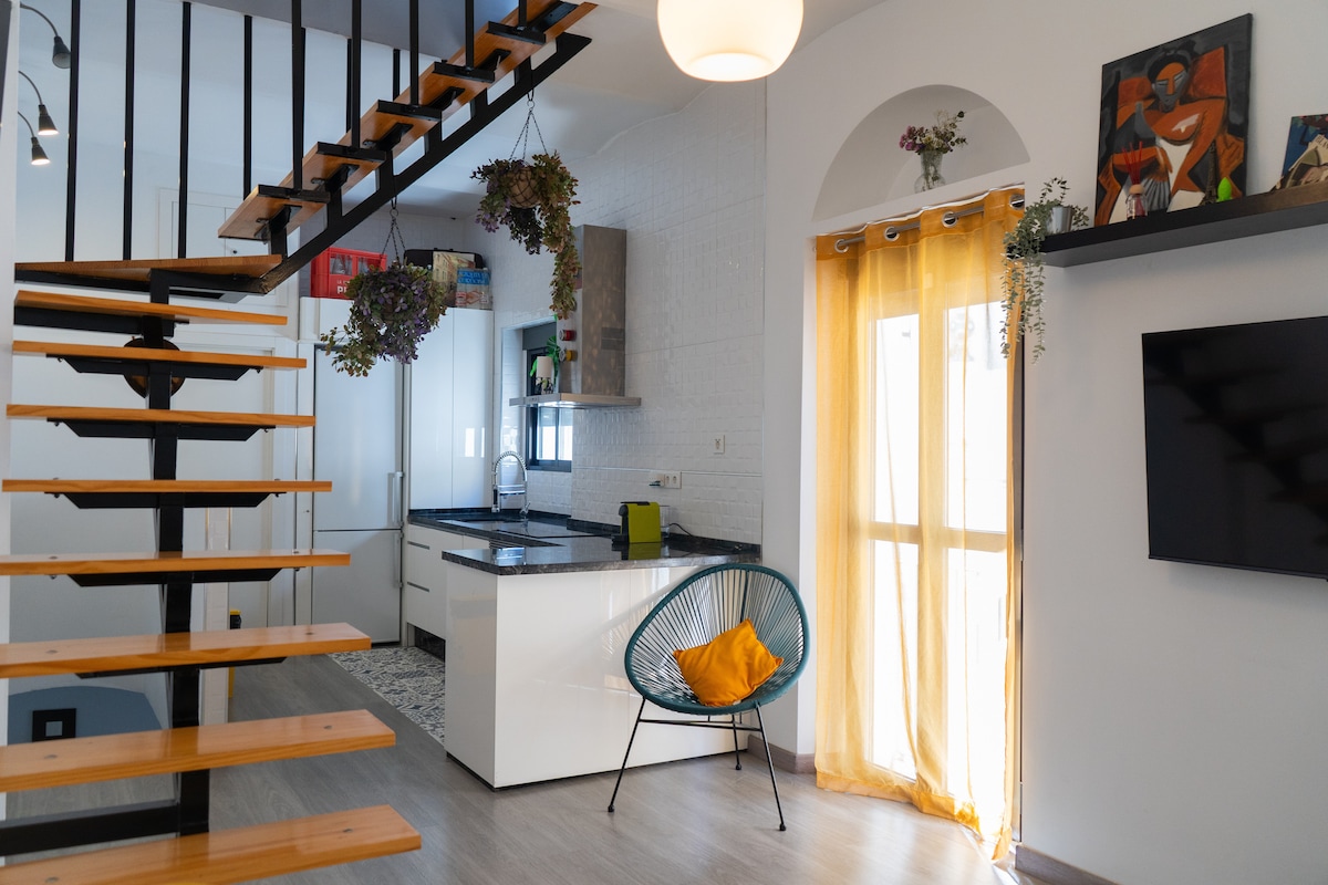 Muy amplio con terraza privada y espectaculares vistas. Una preciosa escalera de madera adorna el amplio salón y su bonita cocina americana. Cómoda cama en la habitación más sofá cama en el salón nuevo. Dos cuartos de baños. Calefacción y aire acondicionado en todas las casa. Muy práctico para aquellos que visiten la ciudad para cortas y largas estancias. Una situación inmejorable a pocos minutos a pie del centro, rodeado de innumerables servicios de restauración, monumentos. Loft único !