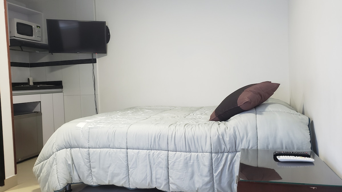 Čudovit apartaestudio z odprtim in svetlim prostorom z zunanjim pogledom in odličnim dizajnom. Udobna dodatna postelja, kavčcama in otroška posteljica. Popolnoma opremljena kuhinja. Hitra povezava Wi-Fi (500 M) Nahaja se v mirnem in varnem območju v bližini Corferiasa, ameriškega veleposlaništva, Movistara, letališča in javnega prevoza. Stavba ima pralnico, velik skupni delovni prostor in sejne sobe. Odlično za pare ali majhne družine, ki iščejo udobje in slog.
