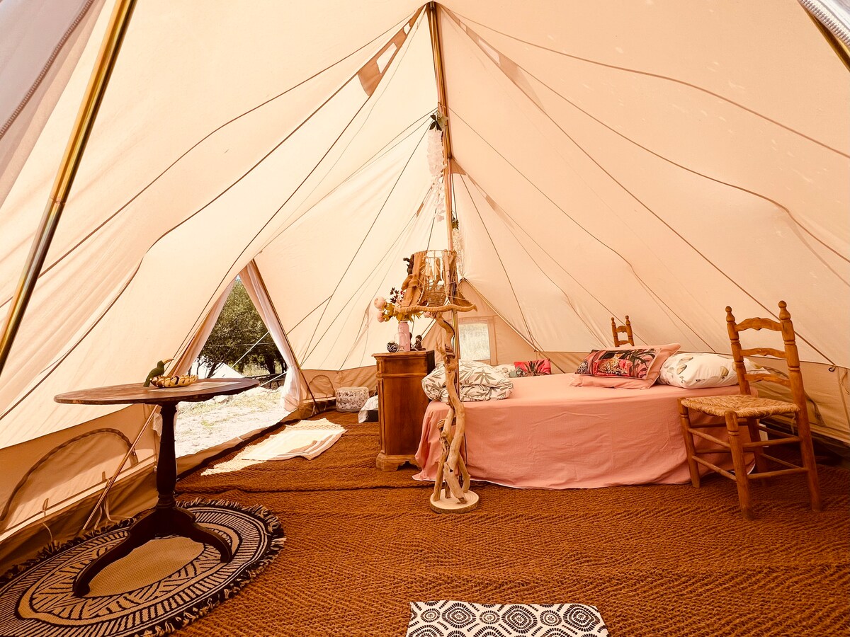 Nastanitev, ki se nahaja v majhnem kampu na kmetiji Ernaghju Ernaghju, premera 6 m, vključno z 1 zakonsko posteljo in 2 enojnima posteljama , lepo opremljena, postelje, izdelane ob prihodu Toaletni papir, gel za prhanje/šampon Skupni sanitarni ventilator 3 prhe, 2 umivalnika, 2 stranišči , elektrika v šotoru. Skupna kuhinja naravna okolica, družinsko vzdušje, viseče mreže...