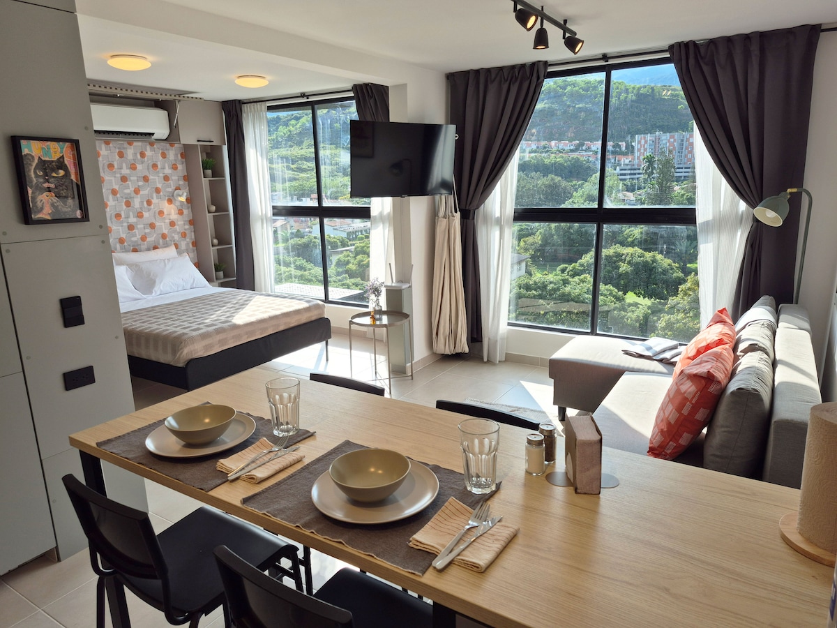 ✨ Uživajte v udobnem in sodobnem garsonjeri v južnem Caliju s spektakularnim razgledom na gore, ki je kot nalašč za turiste, vodstvene delavce ali prenočišča z zdravnikom 🌟 Najboljše v tem bivališču - Edinstven panoramski razgled iz 6. nadstropja - Sodoben, minimalističen in topel slog - klimatska naprava in odlična osvetlitev, - Izjemno hiter Wi-Fi (900 MB) + brezplačen videoposnetek - 1 udobna zakonska postelja (za 2 gosta) -Kuhinja, opremljena z napravami - Zasebna kopalnica z vročo prho