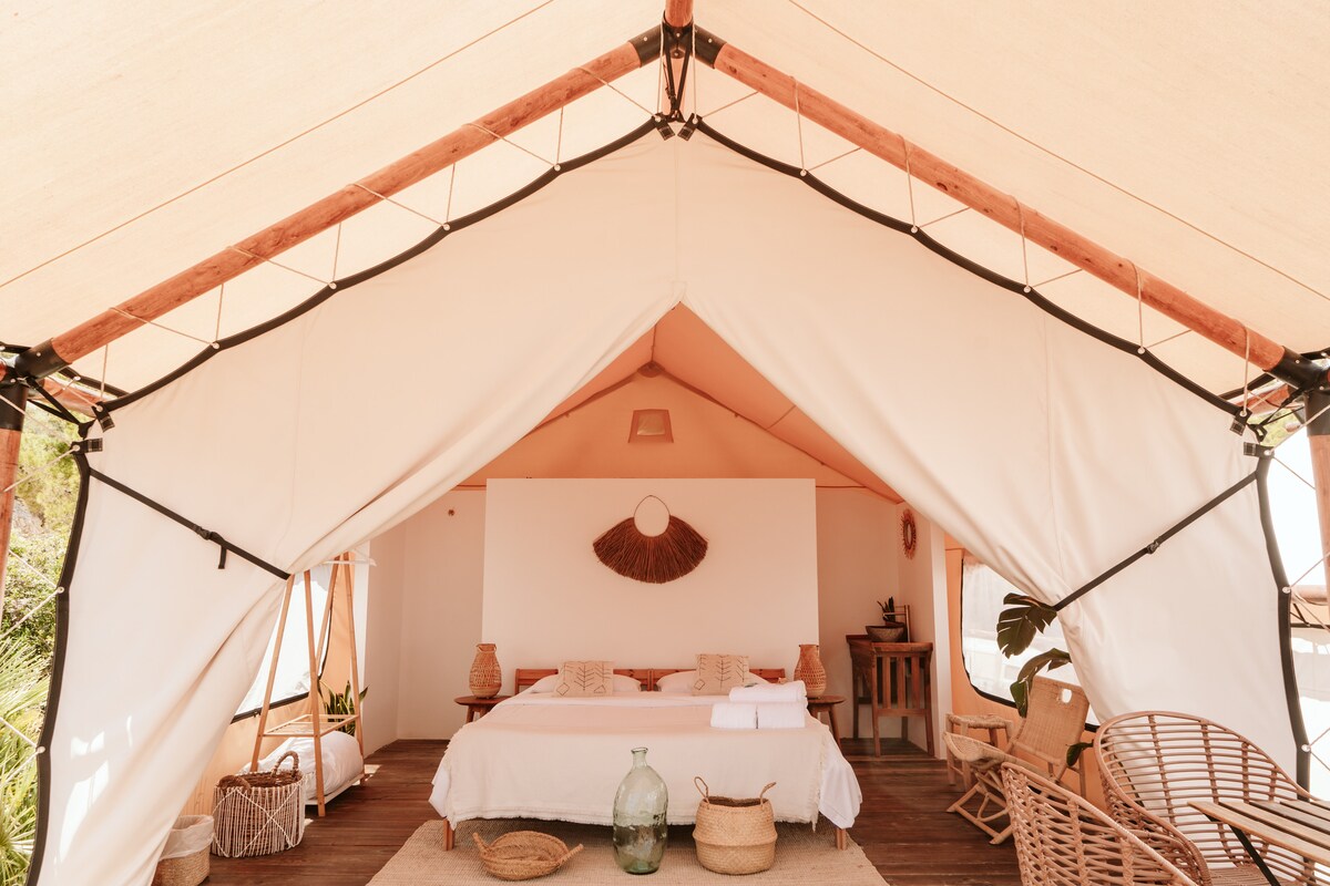 Glamping šotor se nahaja v kampu, ki ponuja druge šotore, skupno kopalnico, restavracijo, bazen, prostor za sprostitev ter najem kajaka in SUP. Kamp se nahaja na vrhu pečine z osupljivim pogledom na ocean nad Cala Moraig v Benitachellu in zagotavlja popolno mešanico pustolovščin in sprostitve.