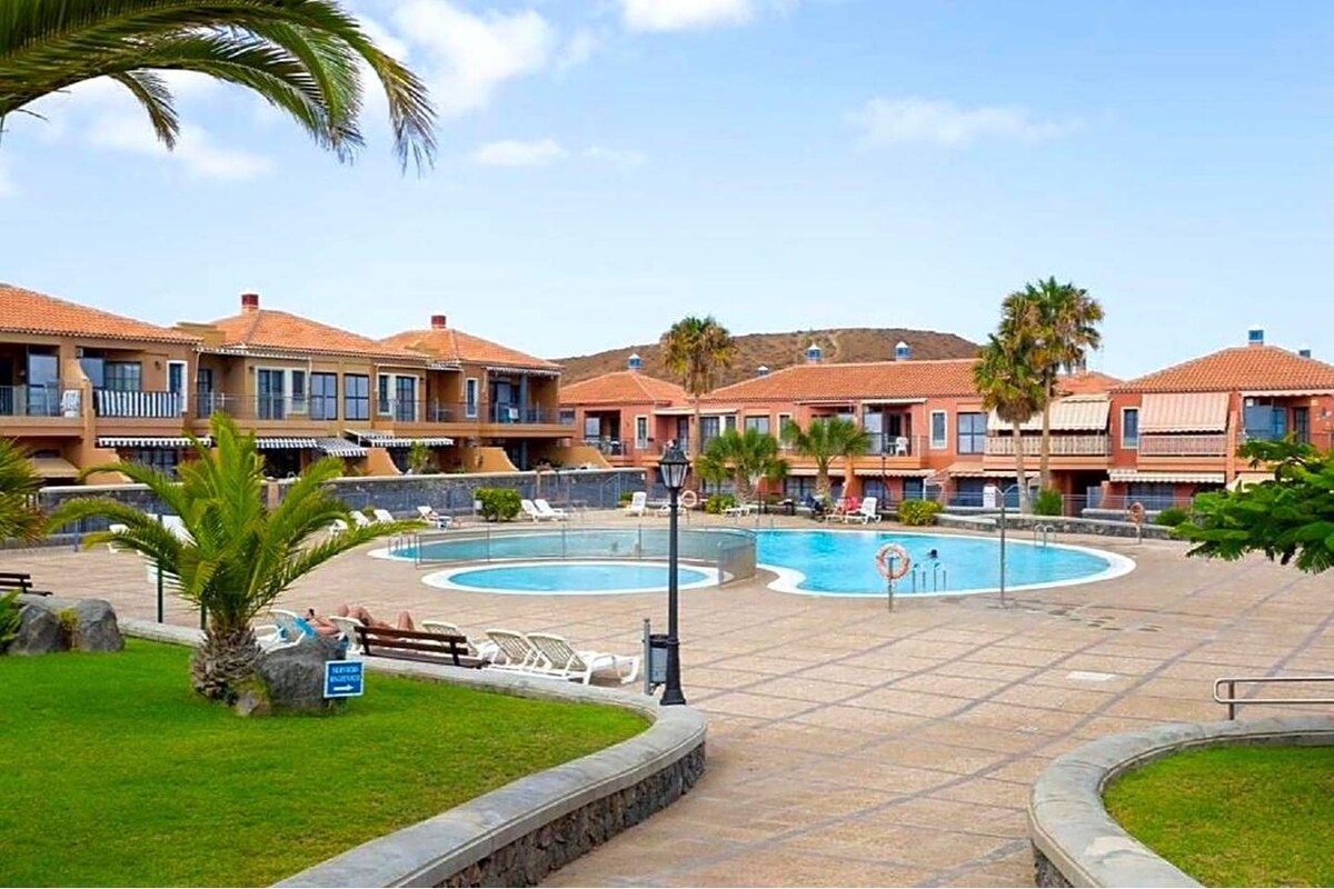 ZLATA OAZA OB PLAŽI. Na novo prenovljeno, popolnoma opremljeno luksuzno stanovanje z zasebno teraso s pogledom na Atlantski ocean in le nekaj korakov od plaže Playa Amarilla. Mirno in daleč od gneče, vendar blizu supermarketa in restavracij. Samo 15 minut vožnje z avtomobilom od letališča Tenerife South. Brezplačno parkiranje tik pod stanovanjem. Bazen skupnosti. Izkušen supergostitelj z več kot 2.200 mnenji.
