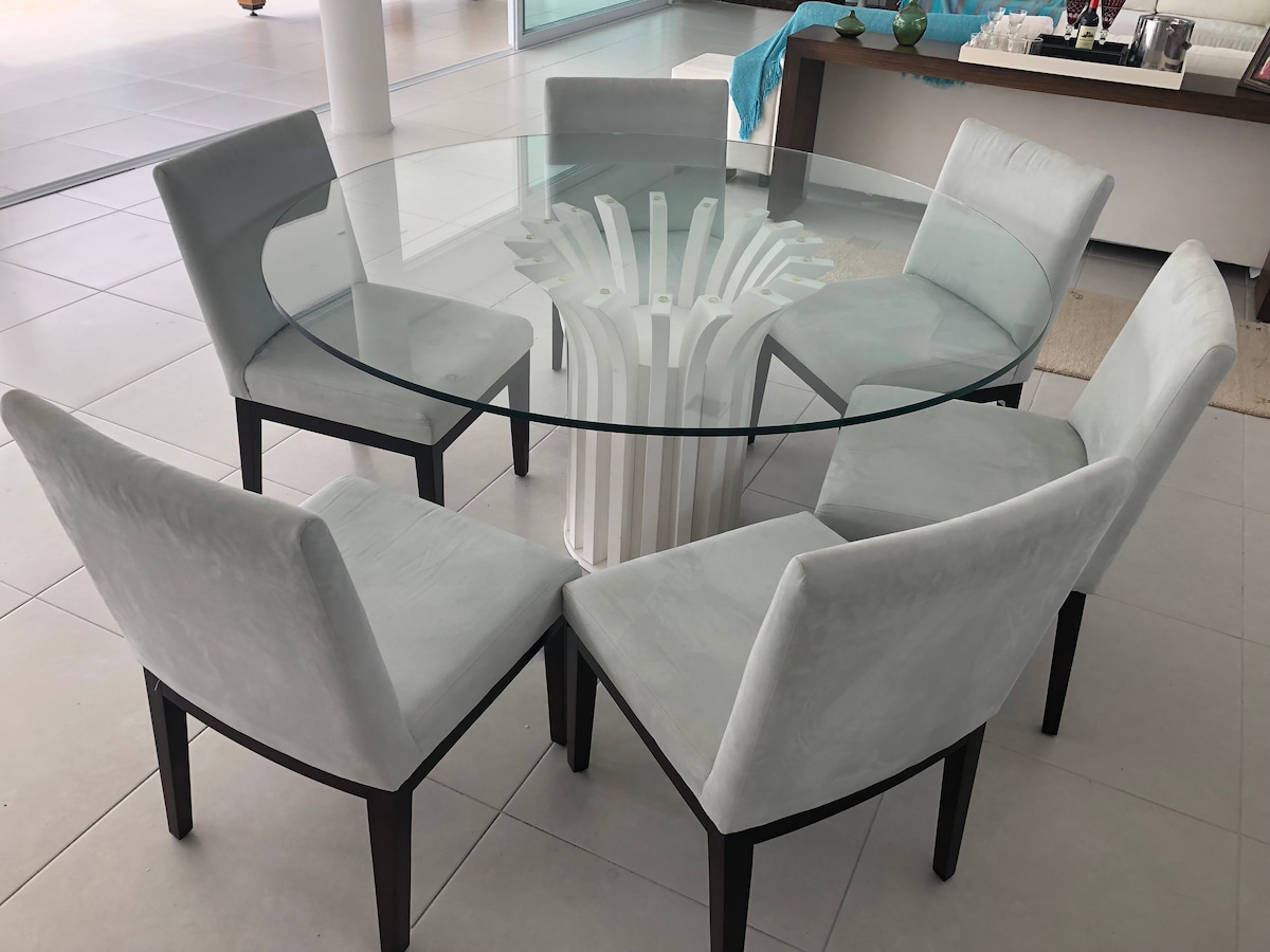 4 veliki apartmaji,žar, zasebni bazen z otroškim igriščem, ležalniki znotraj in zunaj bazena, masažne prhe, razdeljena klimatska naprava v vseh sobah,dnevna soba in kuhinja, sušilnik za lase, 220 volti, 2 parkirni mesti, udobna hiša, popolnoma nova, prostorna in zelo udobna. Balkoni z visečimi mrežami in fotelji za sprostitev ob zvoku ptic in prijetnem vetriču. Stanovanje ima domače storitve na plaži, družinski najem