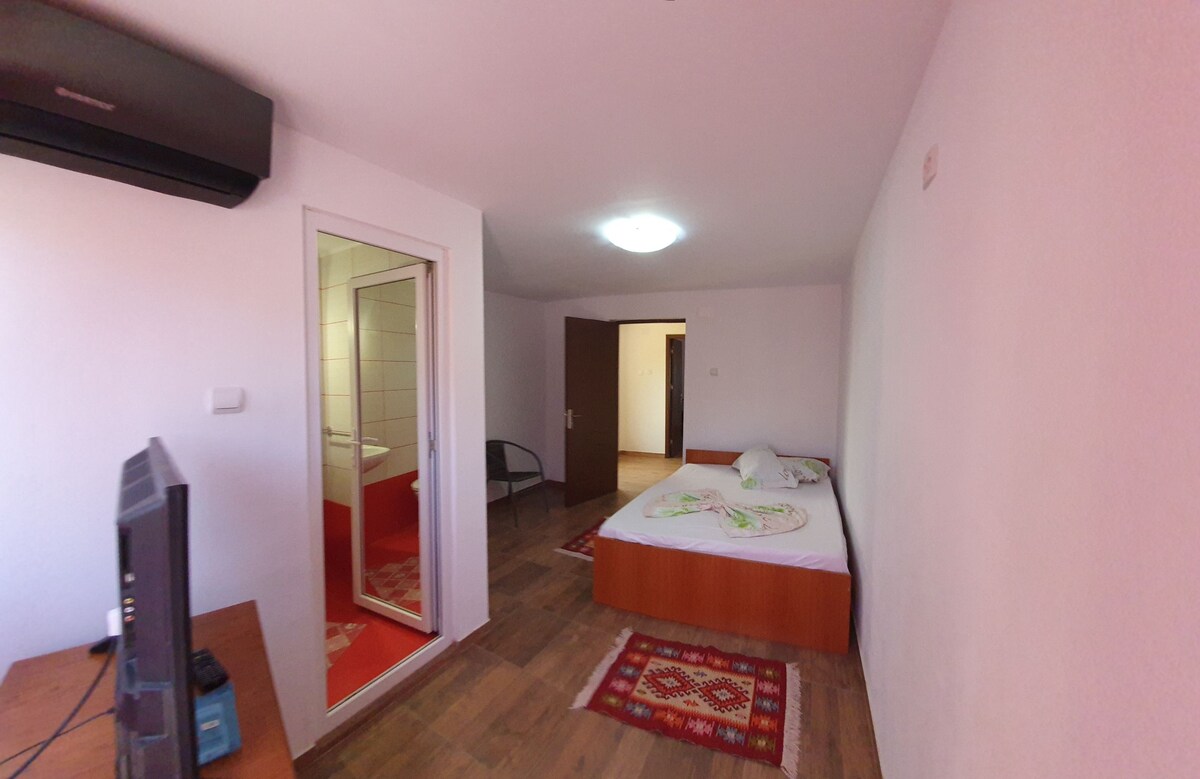 Lokacija se nahaja v mirnem predelu, 7 minut hoje do plaže. Hiša je sestavljena iz 3 dvoposteljnih sob s kopalnico v pritličju in na podstrešju, velike sobe s 6 sedeži,s kopalnico in teraso. Dvorišče ima gazebo, žar, sanitarno skupino (dva wc in prha)in parkirna mesta. Turisti imajo na voljo Wi-Fi internet,kabelsko televizijo in neprekinjeno toplo vodo. Izdajam račun za poravnavo. Cena je med 80-150 Ron na OSEBO in se razlikuje glede na sezonsko obdobje!!!!