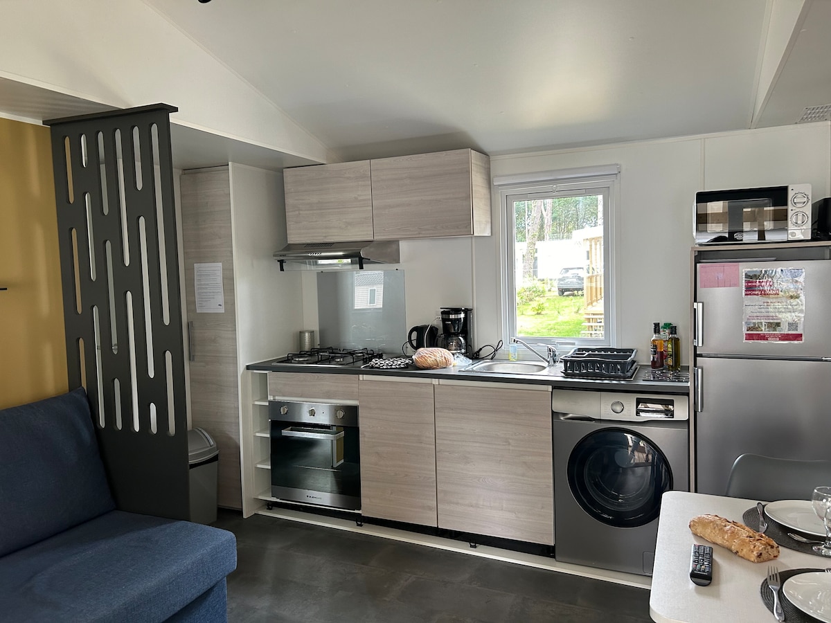Vas zanima počitnice v naravi in 1 km od morja? Naša mobilna hišica čaka na vas. Camping 4☆ les Bois de Bayadène. Novo prenočišče s 40 m², 3 spalnicami, 1 dnevno sobo, 1 opremljeno kuhinjo, 1 kopalnico in 1 ločenim straniščem. Gostje lahko uživajo v dodatnem prostoru zaradi pokrite in ograjene terase +vrat z vrtnim pohištvom. 1 plinski plancha. Ogrevano in nadzorovano vodno območje (int/ext), dostopno z nakupom zabavnih vstopnic iz kampa. Otroški klub, zabava za vsakogar.