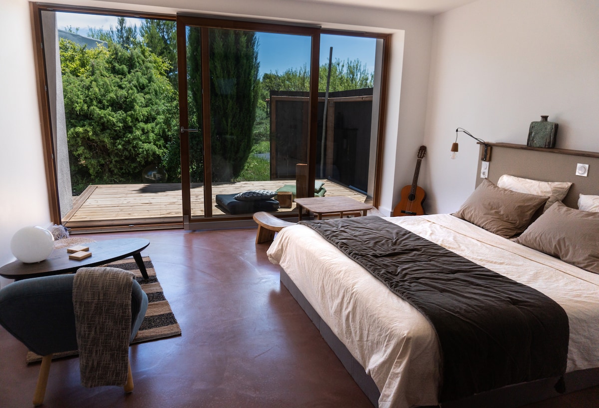 Ns vs proposons une chambre parentale dans 1 villa de plein pied , au calme près de la Mer... de Collioure de l'Espagne à 1 hr de la montagne & ses magnifiques paysages . SALLE DE BAIN PRIVATIVE dans un espace de 15 m2 avec équipements neufs Matelas Télé - 1WC juxtaposé indépendant mais partagé avec nous Draps fournis ' gel douche' pas de serviettes de toilette Pas de possibilité de cuisiner. C'est une '' chambre d'hotes "" je tiens à le préciser,pas de lavage de linge.