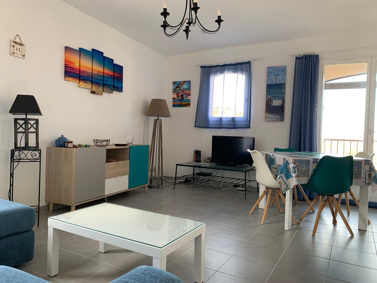 V osrčju talasoterapije je naše malo gnezdo sestavljeno iz jedilnice z zelo udobnim dvosedom in popolnoma opremljeno kuhinjo, spalnico z 2 enojnima ali zakonskima posteljama 140 cm, kopalnico in ločenim straniščem. Terasa s pogledom na morje z mizo in 4 stoli. Na voljo vam bo televizija, wifi, pralni stroj... zasebno parkirišče. Zamenjava v 10 minutah hoje. Neobvezno perilo (70 € za 2 osebi in 100 € za 4 osebe).