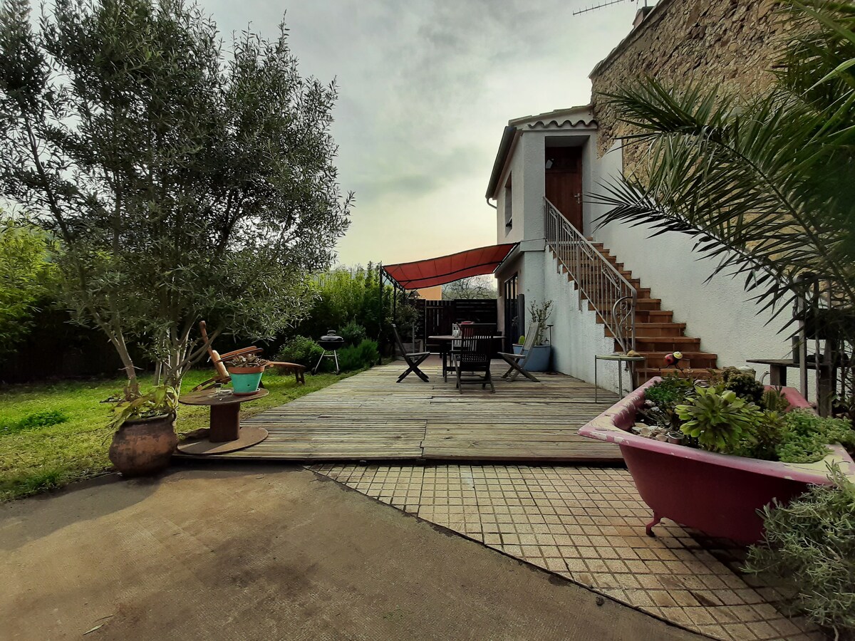 prijetno stanovanje na ravni vrta naše hiše, 2 odrasla + 1 ali 2 otroka največ, ločena spalnica s 140 posteljami, zagotovljenimi rjuhami in brisačami, dnevna soba z raztegljivim kavčem, TV, jedilnica, kuhinja, opremljena s napo, 2 električni kuhalni plošči, pečica + mikrovalovna pečica, aparat za kavo, grelnik vode, opekač kruha, kopalnica, stranišče, velika prha, pralni stroj, likalnik, neposreden dostop do terase, vrt, žar, neodvisen vhod, zalivi, pristanišče je oddaljeno 15 minut hoje, 3 km od Collioureja. Brezplačno parkiranje na ulici. Na voljo sta 2 ventilatorja.