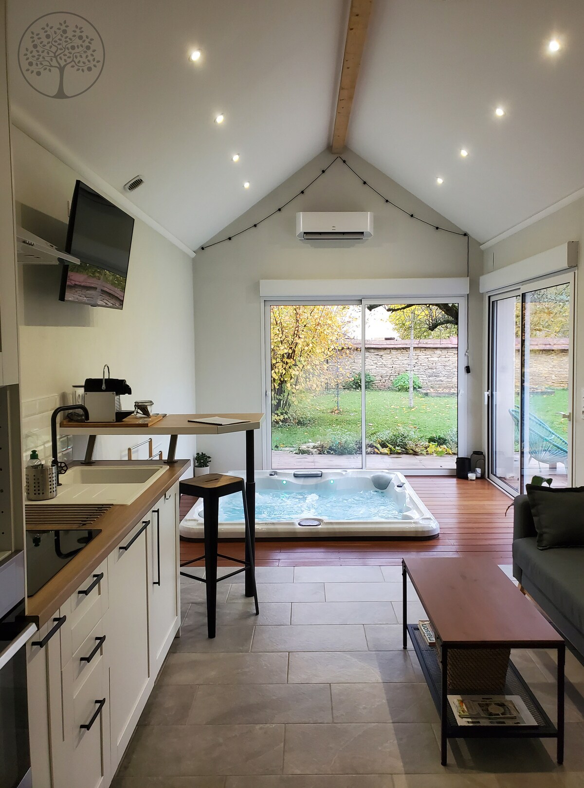 Velika mini-hiška, ki meri 39 m2, v osrčju vasi. Zakopalnik za trenutke z družino, prijatelji ali ljubitelji. Popolnoma opremljena hiška na deželi, vse udobje (nova posteljnina, klimatska naprava, štedilnik na pelete), terasa 20 m2, spa (z žarom), ležalniki, vrtno pohištvo. 2 spalnici: 1 glavni apartma, druga z 2 enojnima posteljama in kopalnico s prho. Gostje lahko uživajo v popolnoma zaprtem zemljišču s površino 500 m2, ki ni spregledano. 2 zasebni parkirni mesti. Enostavno udobje