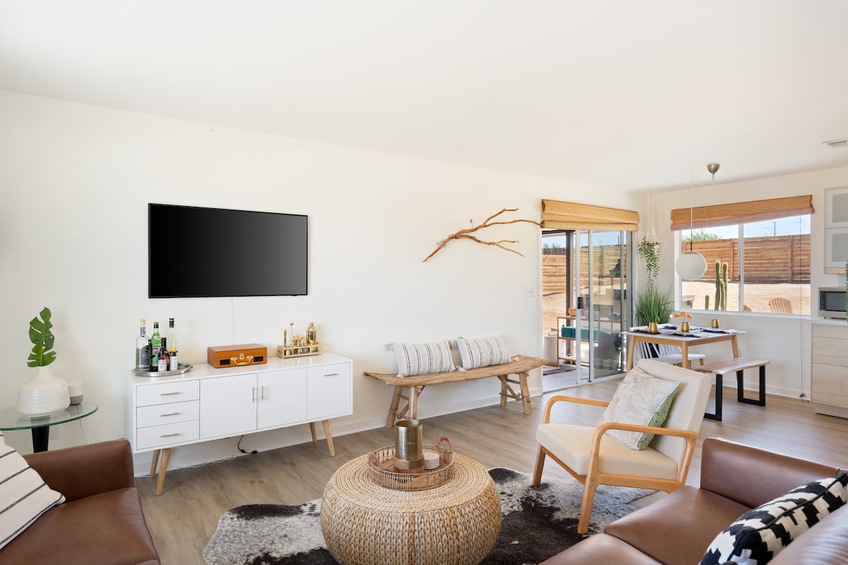 Pobegnite v eleganten bungalov Dreamcatcher Hideaway z 2 spalnicama in 2 kopalnicama v središču mesta Joshua Tree. To sodobno zatočišče je le pol milje stran od živahnih trgovin, restavracij in kavarn ter le 8 km od zahodnega vhoda v narodni park Joshua Tree. Sprostite se v svetlem prenočišču, ki vključuje gurmansko kuhinjo, domači kino, masažno kad, potopne kadi, zunanjo jedilnico, žar na propan, ognjišče, visečo mrežo in polnilnik za električna vozila 2. stopnje.