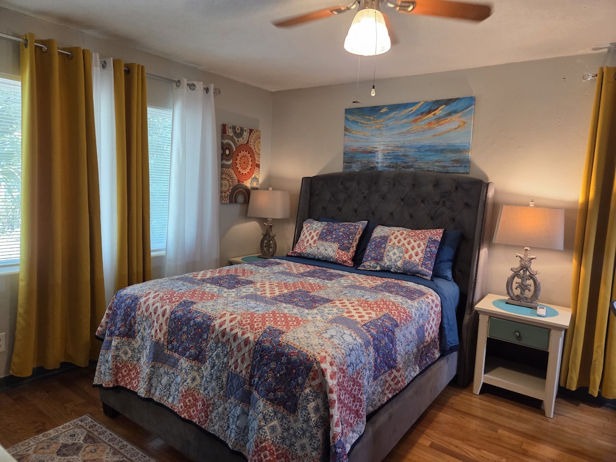 Uživajte v bivanju v tej senčni hrastovi hiši za goste. Nahaja se na naših 2 hektarjih zemljišča s pogledom na sosednje jezero. Naj vas velikost ne zavede, saj ima zakonsko posteljo, majhno kuhinjsko nišo s hladilnikom, mikrovalovno pečico in kavo. Jedilnica se lahko po potrebi podvoji kot delovni prostor. Ima tudi kopalnico v polni velikosti. Ima popolnoma novo klimatsko napravo in čistilec zraka. Ima zunanje sedeže, ograjo za zasebnost in vhod brez ključa. Le nekaj minut stran od JIA, tržnice River City Marketplace, živalskega vrta in terminala za križarjenje.