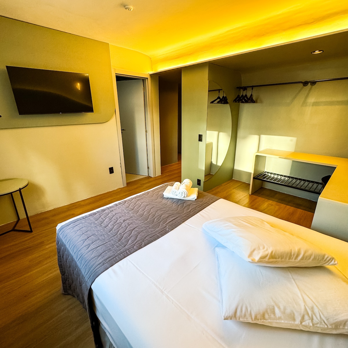 At Studio Spain, we designed a project inspired by the artistic veins of the country. Almodóvar’s colors meet Gaudí’s forms — a filmmaker and an architect who, in different eras, left a dramatic mark on Spanish aesthetics. Our 38m² studio is fully equipped with everything you need for a comfortable and pleasant stay. Strategically located in downtown Criciúma, it’s just a short walk from markets, pharmacies, hospitals, shops, restaurants, and Criciúma’s stadium.
