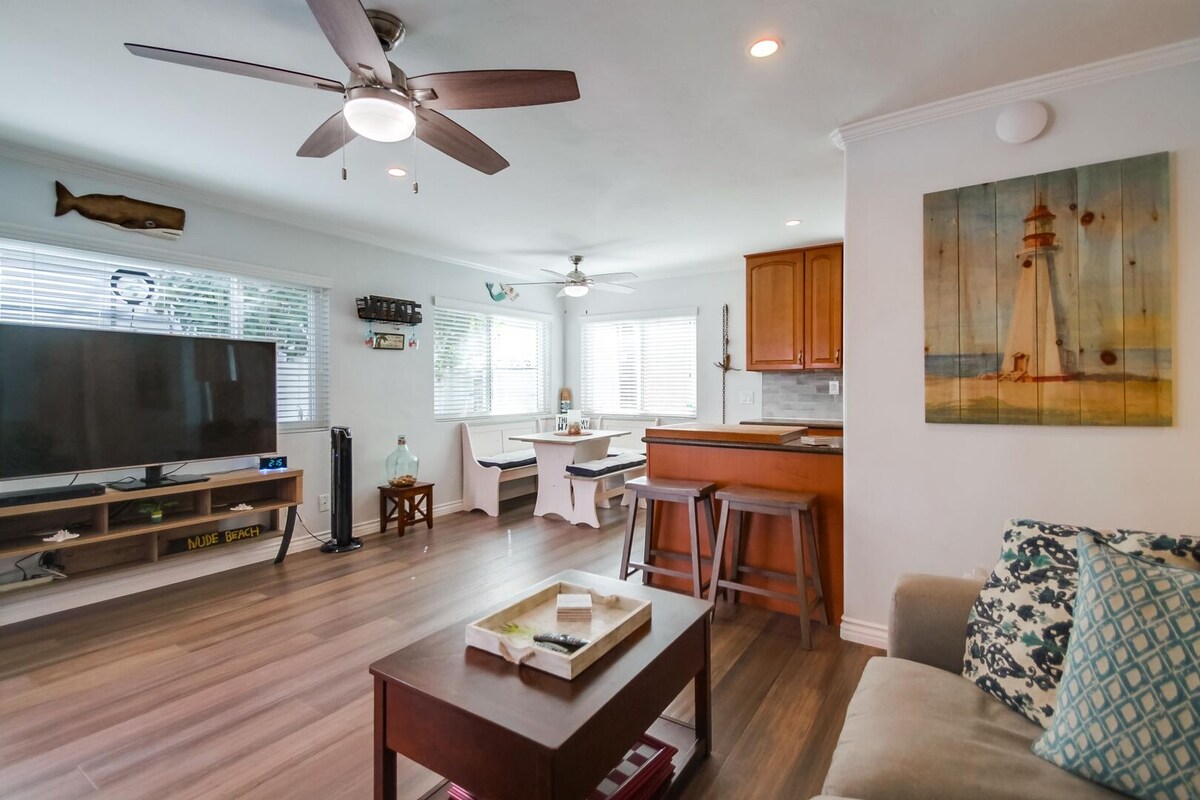 Tik v osrčju Pacific Beacha je čudovito na novo prenovljeno svetlo in zračno prenočišče z 2 spalnicama/2 kopalnicama, zasebnim dvoriščem in masažno kadjo pod lesketajočimi se lučmi. Sprehodite se do najboljšega, kar ponuja PB: restavracije, bari, joga, kava. Plaža/zaliv je manj kot miljo stran. Parkiranje v garaži za 1 avto. Po dnevu na plaži se vrnite domov in uživajte v ognjišču, masažni kadi, igri koruzne luknje ali pa uživajte v filmu v zaprtih prostorih na udobnem velikem kavču. Vedno v celoti založen kavni bar z vrhunskimi kavami.