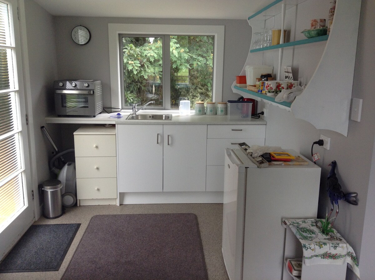 This peaceful, hill top, studio room is just a 10 minute amble to the town’s parks, gardens, cafes, shops and restaurants. Wifi, TV, microwave and small refrigerator, kettle and toaster with basic kitchen cutlery and crockery, teas and coffees supplied. Brand new bathroom. Private entry and driveway with undercover parking. The decor is eclectic and there are two outdoor seating options. The garden is shared. Guest access by key lock. Check in from 3pm and check out by noon.