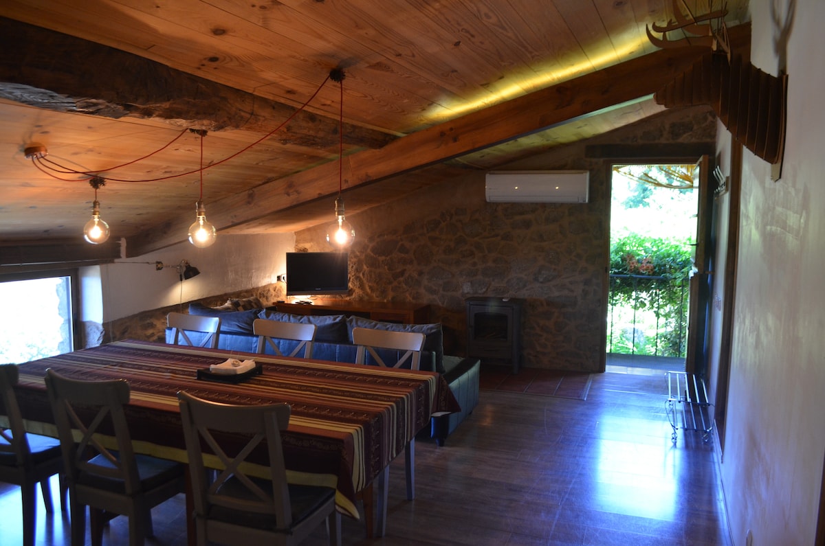 Kamnita in lesena hiša sredi gore, 3 spalnice s 150cm ležiščem, raztegljiv kavč, lahko sprejme do 7 oseb, opremljena kuhinja, 1 kopalnica, TV, wifi, klimatska naprava, štedilnik na les.... Bazen je zaseben za goste in deluje od konca maja do jeseni, ko začne deževati. Zunanji zasebni vrt z žarom To je starinski sušilec tobaka in paprike, obnovljen v udobnem, udobnem, rustikalnem prostoru s sodobno zasuko
