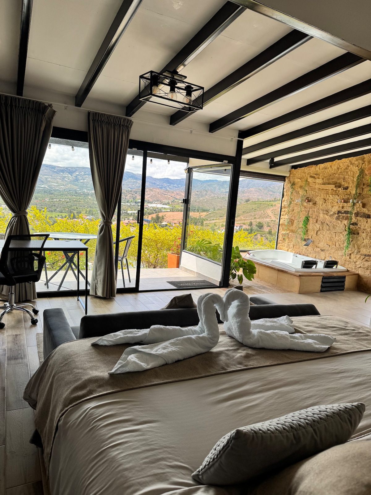 Looking for a unique stay in Villa de Leyva? Our splendid Grand Master Suite with private bathroom combines comfort + timeless elegance. Wake up to stunning sunrise views of the mountains in a cozy, top-notch room perfect for couples or family/friend groups up to 5 + breakfast included. Relax in the floating kiosk by the private lake, enjoy beautiful gardens, animals, basketball court & more. Available upon request: Lunch, BBQ, dinner by the fireplace, shuttles, laundry. NO PARTIES.
