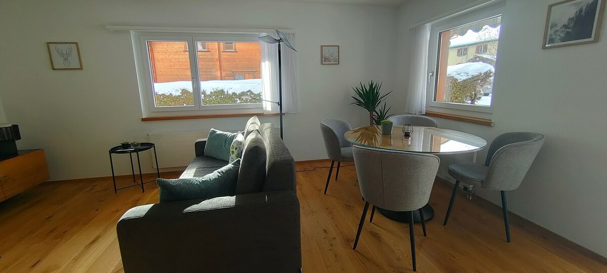 Neu renovierte, stilvolle Wohnung in der Nähe von Skilift. 9 Gehminuten von der Bergstation Braunwald und Lebensmittelgeschäft. Ausgestattete Küche, Balkon mit Aussicht. Ideal für 2 Personen, bietet dank Bettsofa im Wohnzimmer Platz für bis zu 4 Personen. Babyausstattung verfügbar. Skiraum und Fahrradabstellplatz vor Ort. Geniessen Sie ein gemütliches Essen im Restaurant nebenan.