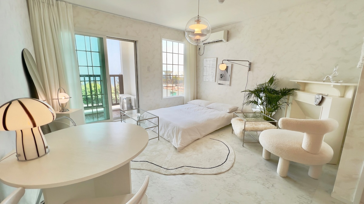 »SEOM Studio«, kjer lahko opazujete čudovito morje Seogwipo in Beomseom za velikim oknom, ki gleda proti jugovzhodu. Če je vreme lepo, lahko stojite na strehi svoje sobe ali otoške stavbe in uživate v toplem oranžnem sončnem zahodu. Ta prostor smo pripravili v upanju, da bo čas, ki ga boste preživeli tukaj, trenutek, da v celoti sprejmete lepoto svojega vsakdanjika. 111, Taepyeong-ro, Seogwipo-si, Jeju-do