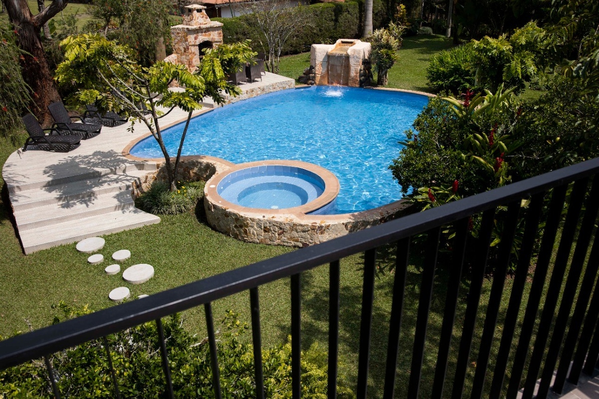 Espectacular casa de campo, moderna, ideal para familias o grupos de amigos, descanso pleno en una zona muy tranquila solo a una hora de Cali, clima templado calor de día y fresco en la noche. Piscina hermosa y jacuzzi, ademas dotada con todo lo necesario para días, semanas o larga estadía. Cocina integral, agua caliente y tv por cable disponible. Este alojamiento único tiene muchos jardines y espacio ademas de arboles frutales en 4000 metros cuadrados para que disfrute con los suyos.