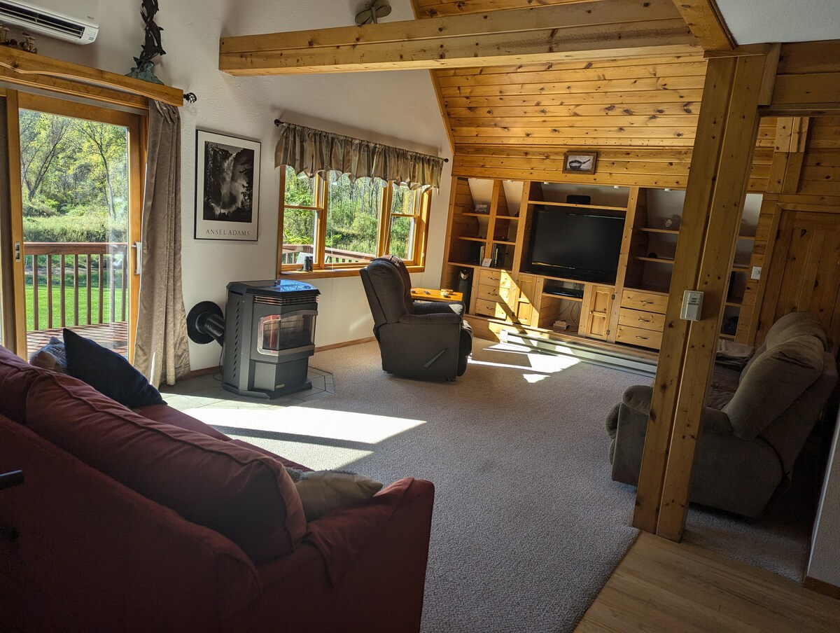 Sprostite se in se potopite v naravo v tej udobni koči s pogledom na Timber Coulee Creek. Velika okna dnevne sobe in prostorna terasa vam nudijo pogled iz ptičje perspektive na valovito reko in številne vrste prostoživečih živali. Jeleni se razprostirajo po posesti; orli lebdejo in pazijo na vse. Purani, veverice, rakuni in nešteto ptic se ukvarjajo s svojim poslom v tem mirnem okolju. Ribolov na postrvi je odlična zabava za tiste, ki radi vržejo vrv. Počitek v naravnem gnezdu.
