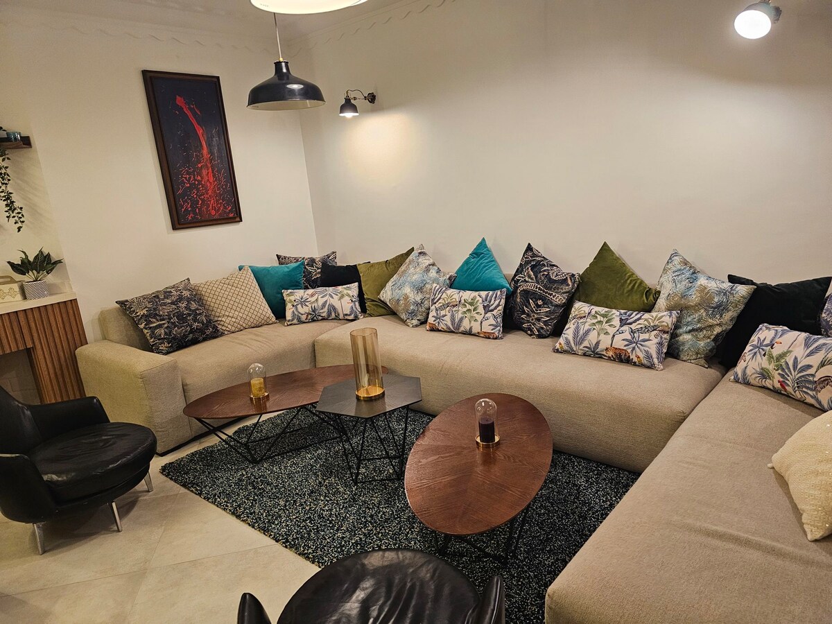 Logement chaleureux et baigné de lumière, offrant un salon spacieux, une cuisine entièrement équipée, deux chambres confortables (un lit double et deux lits ), une salle de bain moderne ainsi qu’un joli jardin fleuri, idéal pour se détendre au calme et profiter du soleil. Ce logement est parfait pour les familles, les amis proches et les voyageurs en quête de confort, sérénité et bien-être. Par respect des traditions et de la réglementation locale, les couples non mariés ne sont pas acceptés.