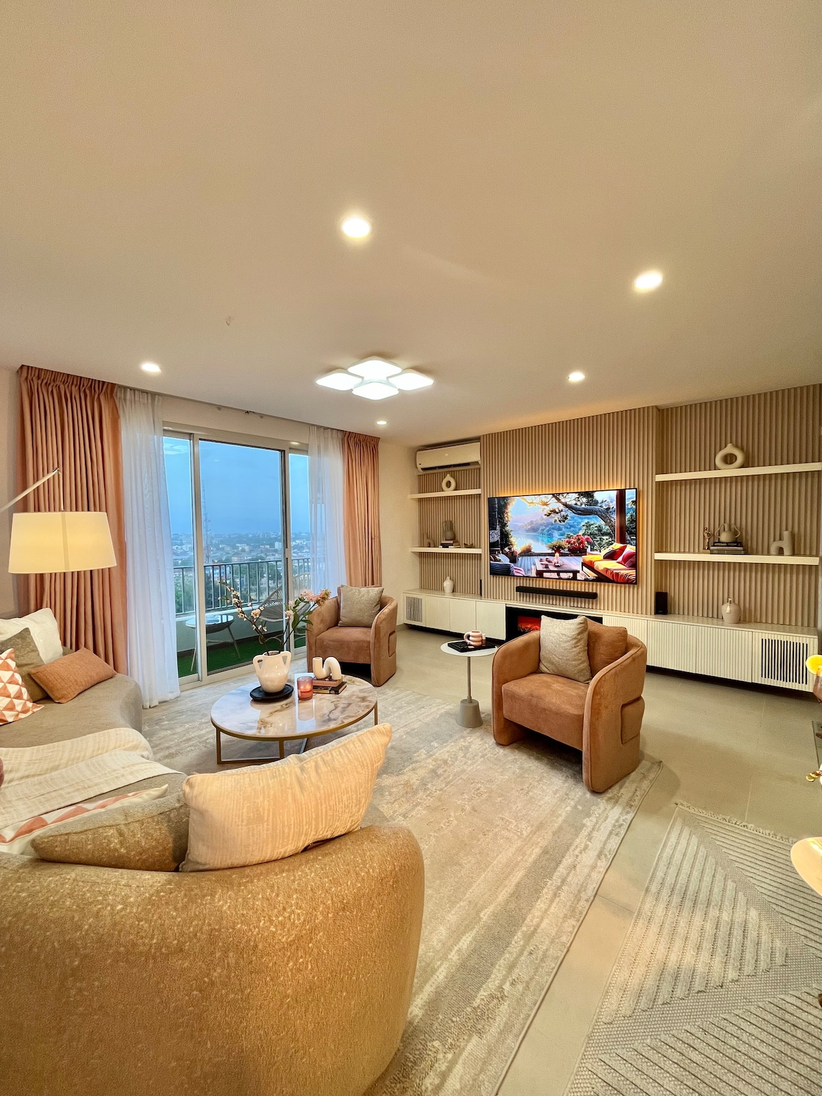 Perched high above the city, blending modern elegance with cozy charm. Designed for those who love spacious living and breathtaking skyline views, sunsets, and twinkling city lights. The mix of modern and warm rustic accents, with vibrant touches and decor that add a pop of warmth and energy, makes the open-plan living area and equipped kitchen perfect for unwinding in style. Close to Palm Village, close to the beach, Mikocheni Plaza and Shoppers Plaza, about 15 minutes to the city centre.