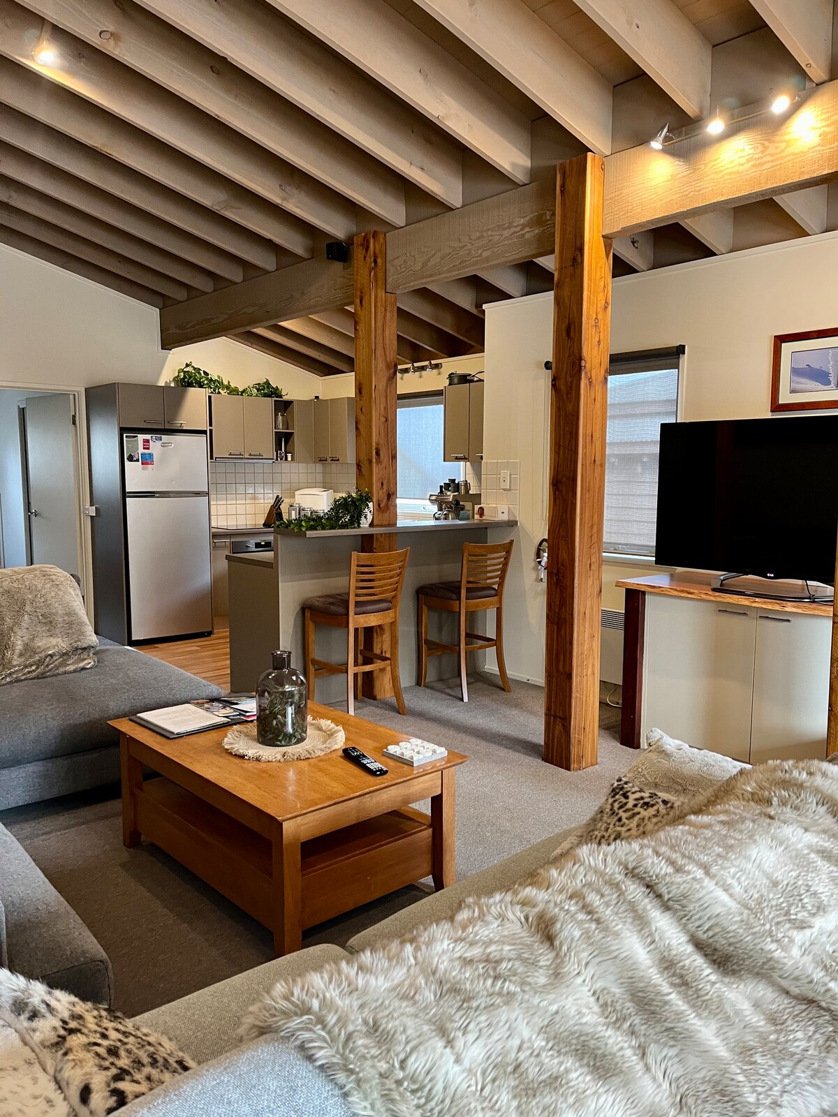 Fantastic location, sunny & cosy 2 bedroom apt with stunning views of Mt Spion. Sleeps 5. 5 in bedrooms, or 1 on sofa bed). Ski in- ski out, 2-5 minute walk to most restaurants, bars & cafés. Wifi. Note: SKI SEASON - Includes linen and cleaning. OUT OF SKI SEASON - low rates are for BYO linen and self clean.