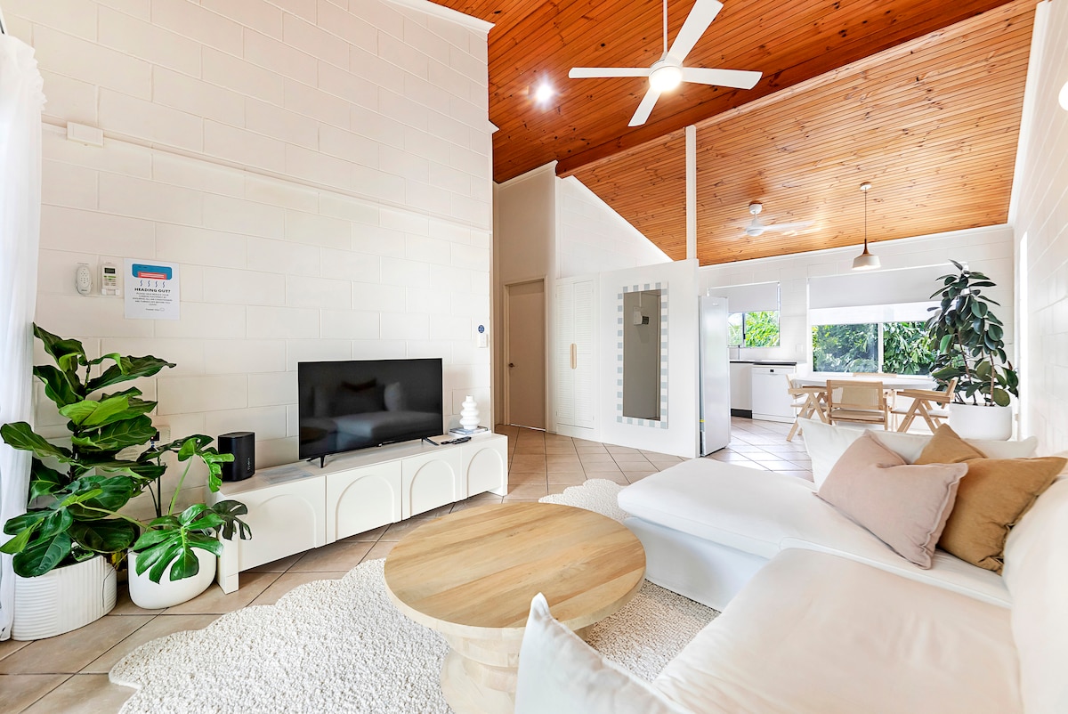 * SPA NI NA VOLJO ZARADI POŠKODB CIKLONA FINA – ČAKA SE NA POPRAVILO ZAVAROVALNICE – uporabljeno znižanje cene * Popolnoma samostojno, klimatizirano dvosobno stanovanje v dvojčku (ena sosednja enota). Zakonska postelja v spalnici in dva raztegljiva/zložljiva kavča v dnevni sobi. Parkirišče ob ulici in dvorišče, polno tropskih rastlin – vendar ni odporno proti pobegu zaradi poškodb, ki jih je povzročil ciklon. Dodatno varno pokrito območje – primerno za hišne ljubljenčke. Čas prihoda in odhoda je zelo prilagodljiv.